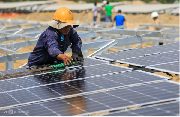 Công nhân lắp đặt các tấm pin điện mặt trời tại một dự án ở Ninh Thuận, tháng 2/2019. Ảnh: Quỳnh Trần